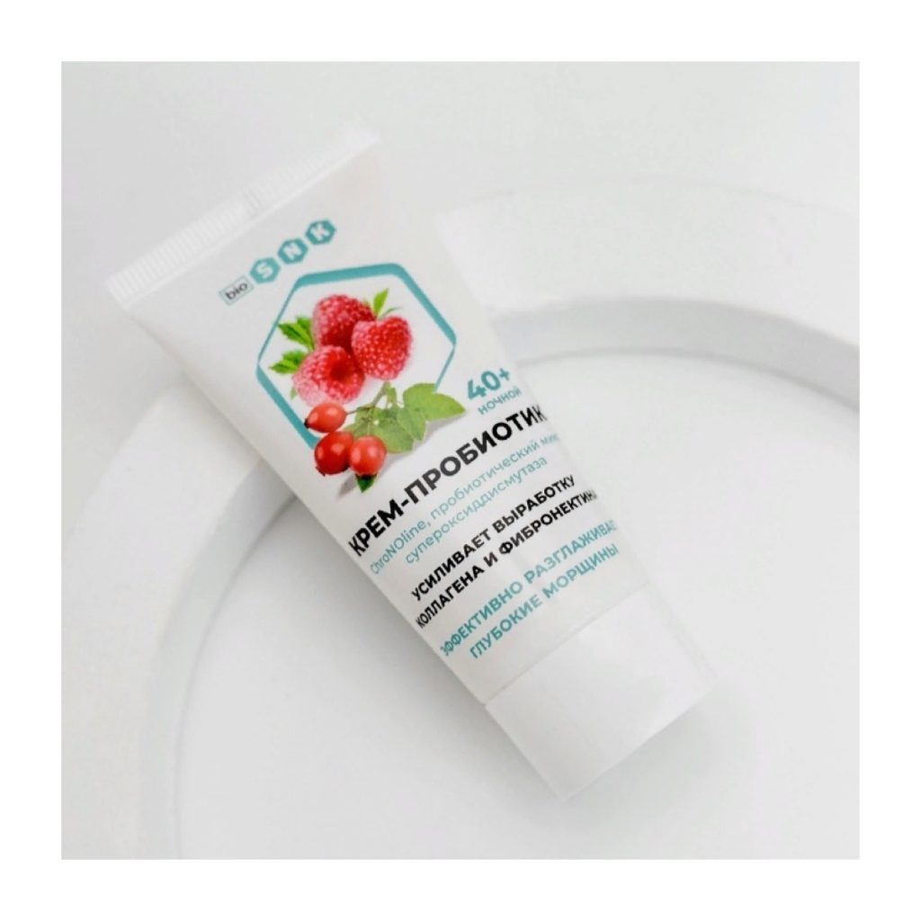 Основное назначение крема – антивозрастное. Наш ночной крем-пробиотик содержит очень мощный компонент: ChroNoline (Хронолайн) это самый эффективный косметический, антивозрастной пепдид, он состоит из 4 аминокислот, связанных с липидом, что обеспечивает его высокую проницаемость в клетки. За счет действия активных компонентов крем уменьшает сеть мелких морщин и разглаживает глубокие морщины, дает быстрый и устойчивый эффект. Биологически активный комплекс низкомолекулярных пептидов регенерирует и обновляет клетки кожи, улучшает упругость. В течение дня в тканях кожи, особенно на открытых участках накапливаются свободные радикалы, которые в ночное время повреждают ДНК и другие биологические активные молекулы, поэтому использование эффективных антиоксидантов чрезвычайно важно. Мы используем СОД: Супероксиддисмутаза (Superoxide Dismutase, SOD) мощный энзимный антиоксидант с высокой степенью биодоступности, нейтрализует свободный радикал супероксид, вследствие чего происходит: защита клеточных мембран, блокируется процесс старения, обладает противовоспалительным действием, позволяет предотвратить потерю на клеточном уровне коллагена и гиалуроновой кислоты. Гиалуроновая кислота обладает уникальной способностью связывать воду и является трансдермальной системой доставки других активных компонентов, необходимых для здоровья и молодости нашей кожи. В комплексе с маслами, экстрактами используемыми в нашем ночном креме, гиалуроновая кислота играет важную роль в гидродинамике тканей кожи для питания и увлажнения, для регенерации кожи, для предотвращения разрушения коллагена. Ночной крем 40+ содержит пробиотический продукт из сока ягод. При изготовлении этого продукта используется Артезианская вода, богатая микроэлементами. Сок смородины, вишни и ирги обеспечивает практически полный набор витаминов, таких как: С, В9, Е, А, В5, В2, Р, КАРОТИН и др. И микроэлементов, таких как: K, P, Ca, Fe, Cu, Co, Mn, Al и др. В симбиозе с экстрактами образуется полноценный коллаген, нормализуется внутриклеточный обмен веществ, идет восполнение резерва клеток, кожа становиться упругой и сияющей. Данный крем представлен на wildberries в обновленном дизайне, цена может отличаться от сайта, ссылка: Крем для лица ночной антивозрастной БИО СНК в интернет-магазине Wildberries.