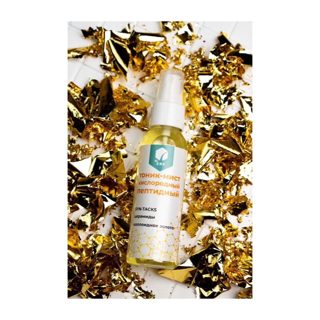 Тоник-мист кислородный пептидный производится с использованием технологии оксигенации, специальной подготовки воды, насыщающей ее кислородом. Вода с активным кислородом способствует усвояемости активных веществ и регулирует клеточное дыхание. В качестве биостимулирующего анти-эйдж компонента тоник содержит коллоидное золото. Пептидный комплекс SYN-TACKS (Син-Такс) стимулирует выработку коллагена В составе: Гидролатный комплекс тоника работает на омоложение: цветы липы обладает успокаивающим действием, бессмертник – признанный растительный стимул выработки коллагена, курильский чай обладает антиоксидантным действием. Церамиды в составе восстанавливают гидро-липидный слой эпидермиса. Пептидный комплекс SYN-TACKS (Син-Такс) возвращает коже упругость, способствует выработке коллагена различных типов. Наночастицы коллоидного золота помогают запустить собственные регенеративные процессы в коже, дополняют и активируют состав тоника. Золото мощный анти-age актив, действующий на клеточном уровне. Тоник-мист с пептидами и коллоидным золотом отлично встроиться в уход на сохранение молодости кожи, без ограничений по возрасту. Особенно благодарно будет воспринят кожей 30+ с первыми признаками потери упругости. Активные тоник-мисты BioSNK могут быть использованы как водная программа ухода из трех тоников. В этом случае, тоники используются с чередованием утреннего и вечернего нанесения.