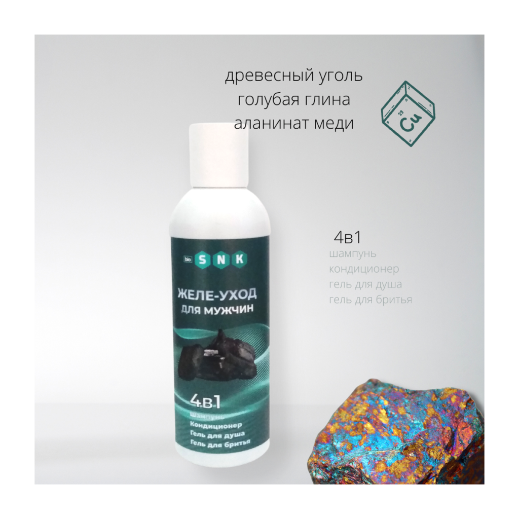Особенность рецептуры — в достижении идеальной точки баланса. Густая консистенция удобна для всех сфер использования, включая бритье. Не стекает, отлично пенится, расходуется экономично. Инновационным решением стало использование аланината меди, в качестве антимикробного и биостимулирующего актива. В составе: В сердце формулы два природных адсорбента: древесный голь и голубая глина. Пенную основу составляют мягкие ПАВ на основе кокосового масла. Сочетание ПАВ + адсорбент, делает очищение достаточным для мужской кожи и волос, склонных к повышенному выделению себума. Природными адсорбентами достигается комфорт – уголь и глина действуют по принципу впитывания излишков, вместо полного удаления защитного липидного слоя. Снимает раздражения и поддерживает микробиом пробиотическая добавка собственного производства BioSNK: продукт ферментации алтайских ягод вишни, ирги и смородины. Увлажняет пентавитин – растительный комплекс длительного действия. Питает и кондиционирует бетаин и гидролизованный кератин в составе. Ключевым технологичным компонентом желе-уход 4в1, является аланинат меди. Биокомплекс аминокислоты аланин с медью выполняет двойную функцию: препятствует размножению грибковой микрофлоры (защита от перхоти) и обеспечивает оптимальное функционирование волосяных фолликул (защита от потери волос). В эпидермисе аланинат меди стимулирует целый ряд процессов, от выработки коллагена до регенерации и производства нативного фермента-антиоксиданта супероксиддисмутазы. Это означает, что кожа надолго сохранит тонус, а волосяные фолликулы получат достаточно питания. Свежесть и длительное ощущение чистоты дарят эфирные масла чайного дерева и можжевельника.